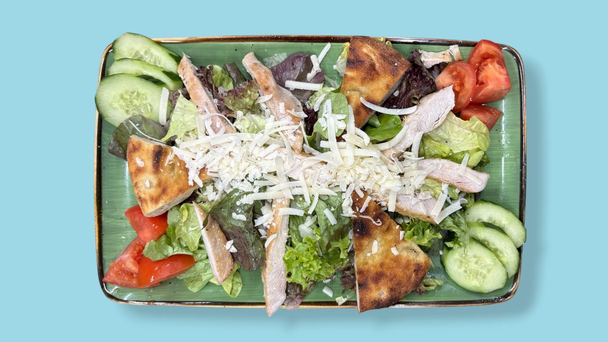 Salat, gebratene Hähnchenbruststreifen, Parmesan, Tomaten, Gurken und Focaccia-Ecken