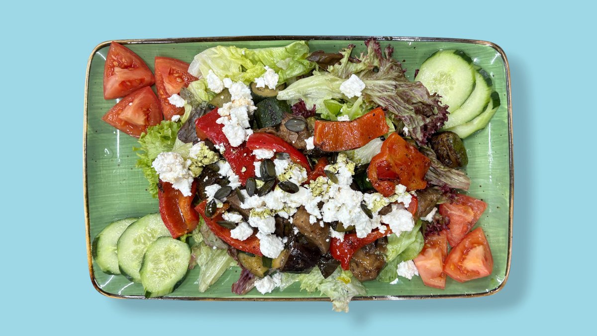 Salat, gegrilltes Gemüse, Schafskäse und Kürbiskernen