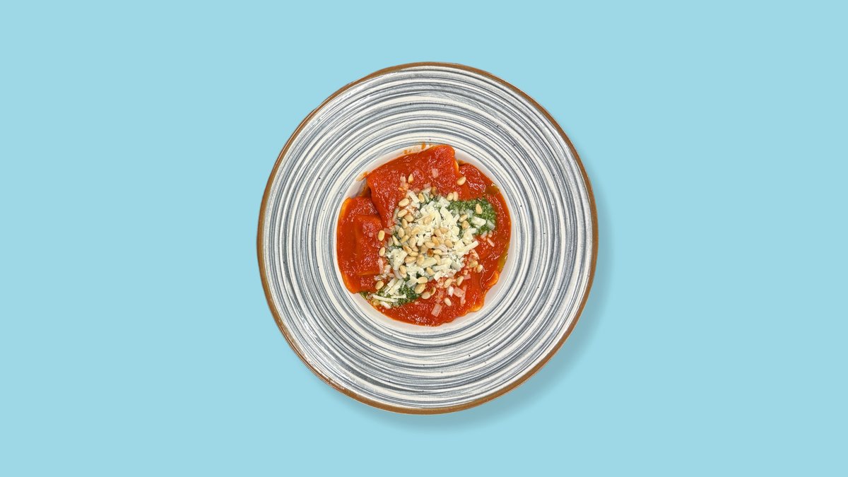 frische Ravioli mit Ricottafüllung in Tomatensugo, Pinienkernen und Basilikumpesto