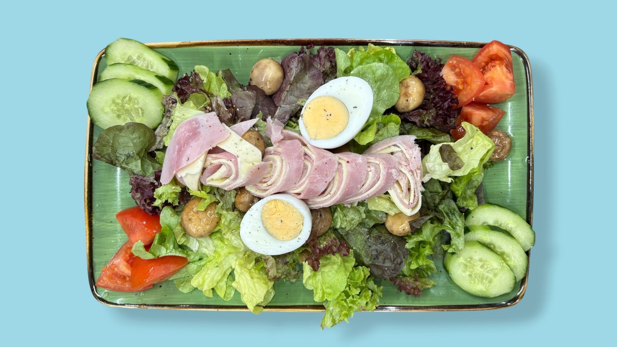 Salat, Käse, Schinken vom Schwein, gebratene Champignons und Ei