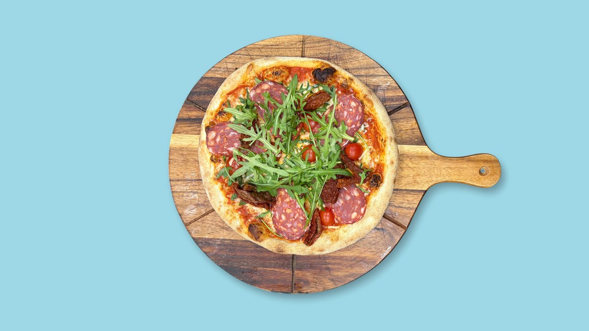 scharf mit getrockneten Tomaten, Scamorza, Rucola und scharfer Salsiccia vom Schwein