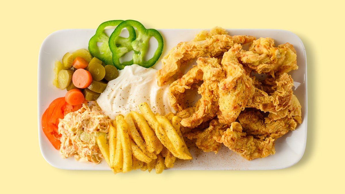 scharf mit frittiertem Hähnchenfilet, Krautsalat, Pommes frites, eingelegten Gurken und Rote Beete