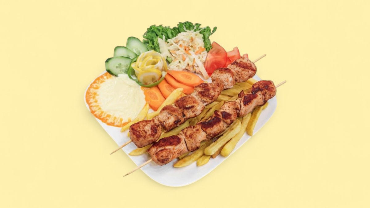 2 Stück gegrillte Hähnchenspieße mit Krautsalat, Pommes frites und Knoblauchcreme