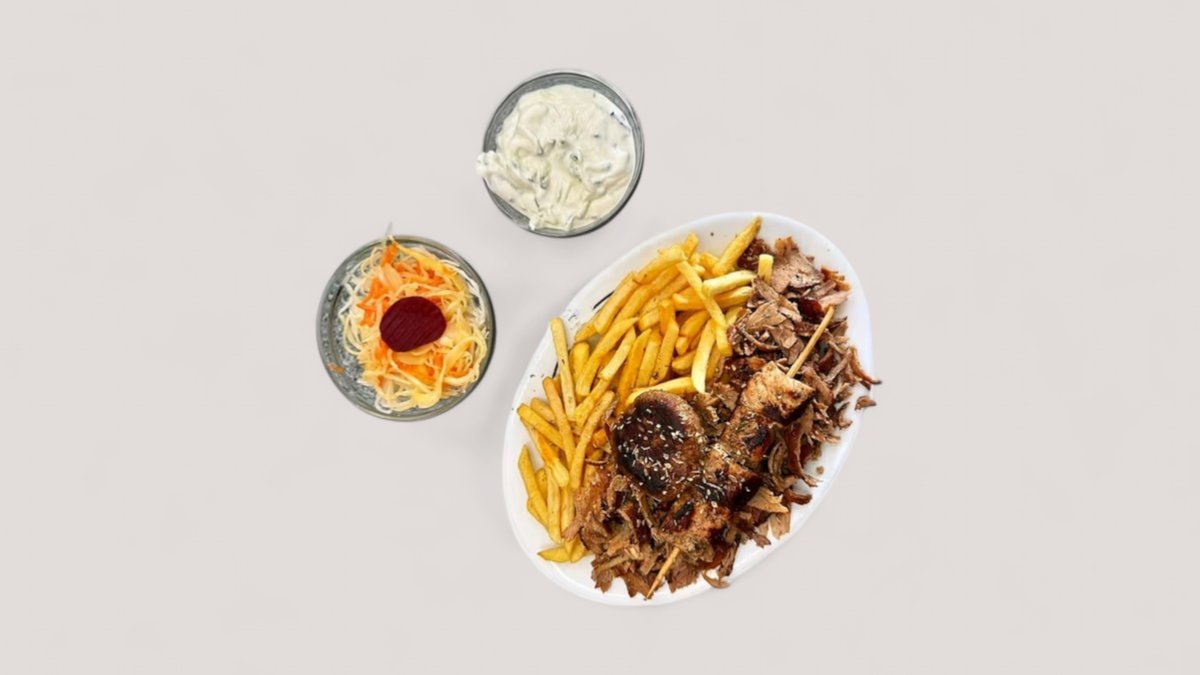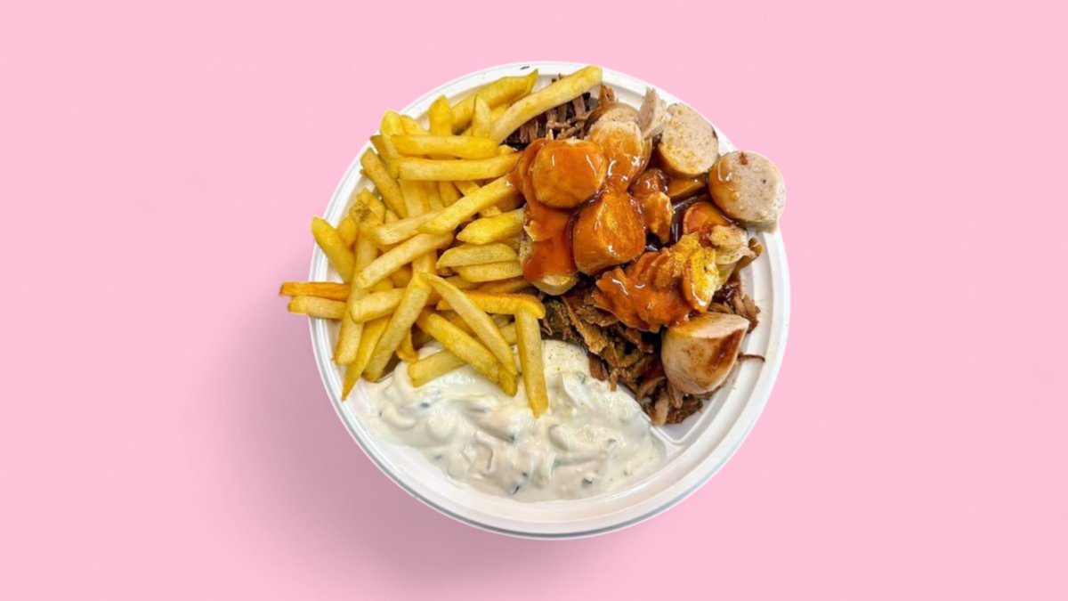 mit Gyros, Currywurst, Pommes frites und Tsatsiki