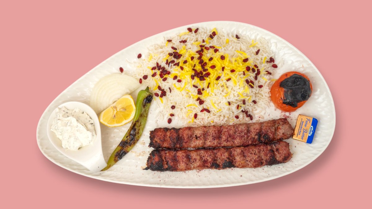 gegrillte SpieĂźe von Rind- und Lammhackfleisch, traditionell gewĂĽrzt mit Safranreis