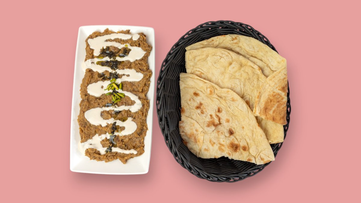 mit pürierten Auberginen, geröstetem Knoblauch, Zwiebeln, Walnüssen, Cashewnüssen, Minze und Brot