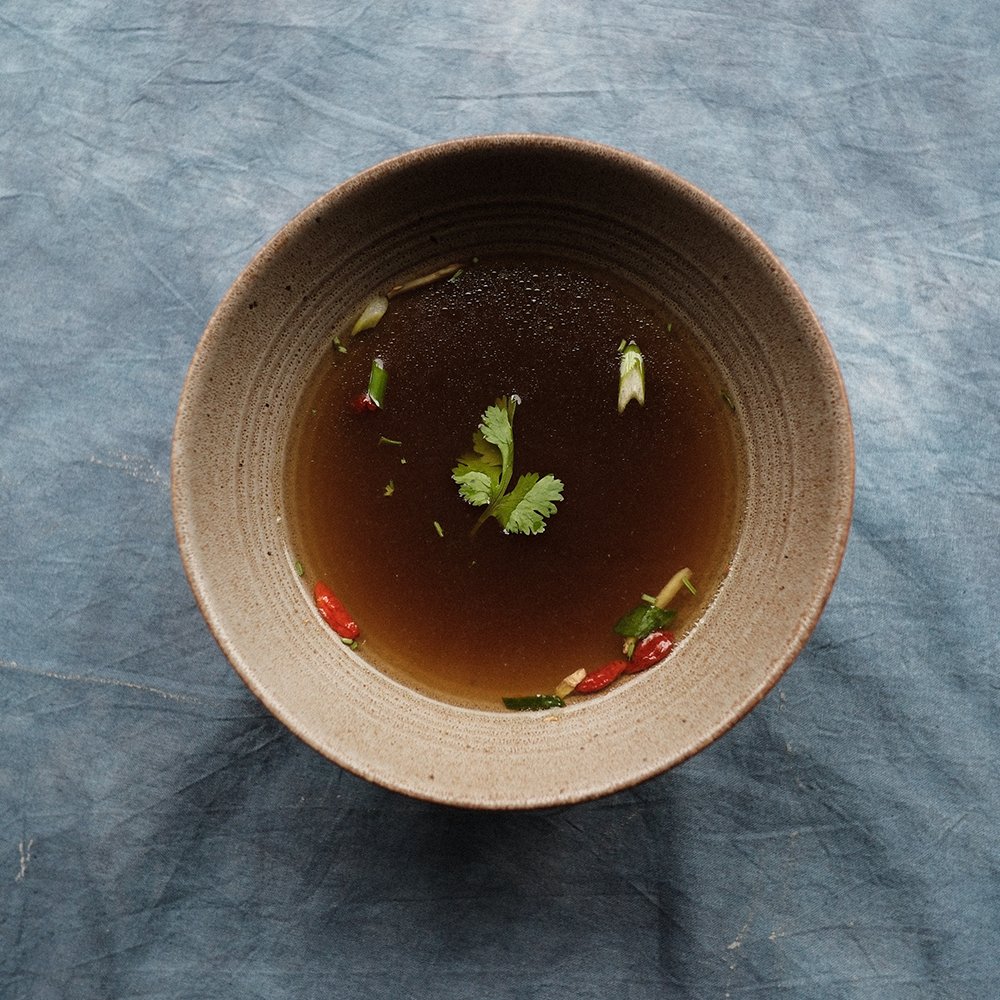 aromatische Knochenbrühe vom Hähnchen mit Gemüse, Goji-Beeren, roten Datteln und Ingwer