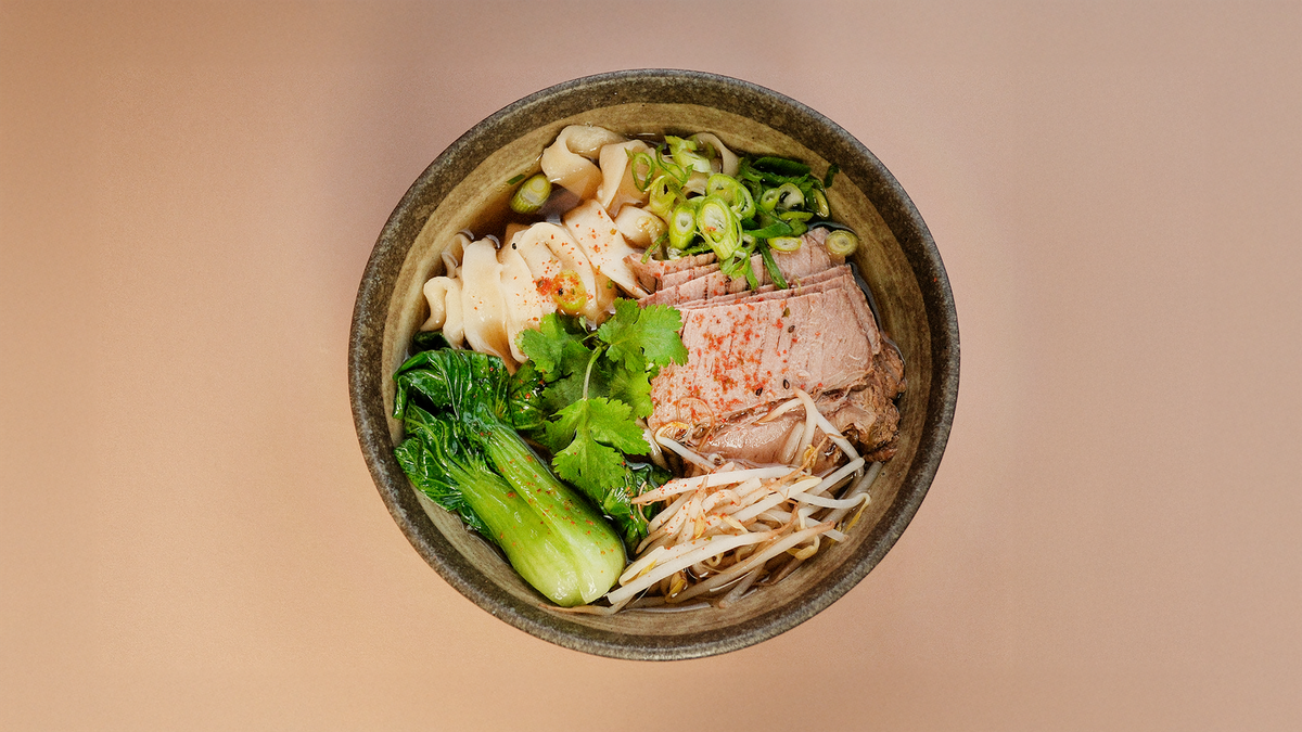 Nudelsuppe in klarer, langsam-gekochter Ingwer-Knochenbrühe mit Pak Choi, roten Datteln, Goji-Beeren und frischen Kräutern a la Pho Bo - mild