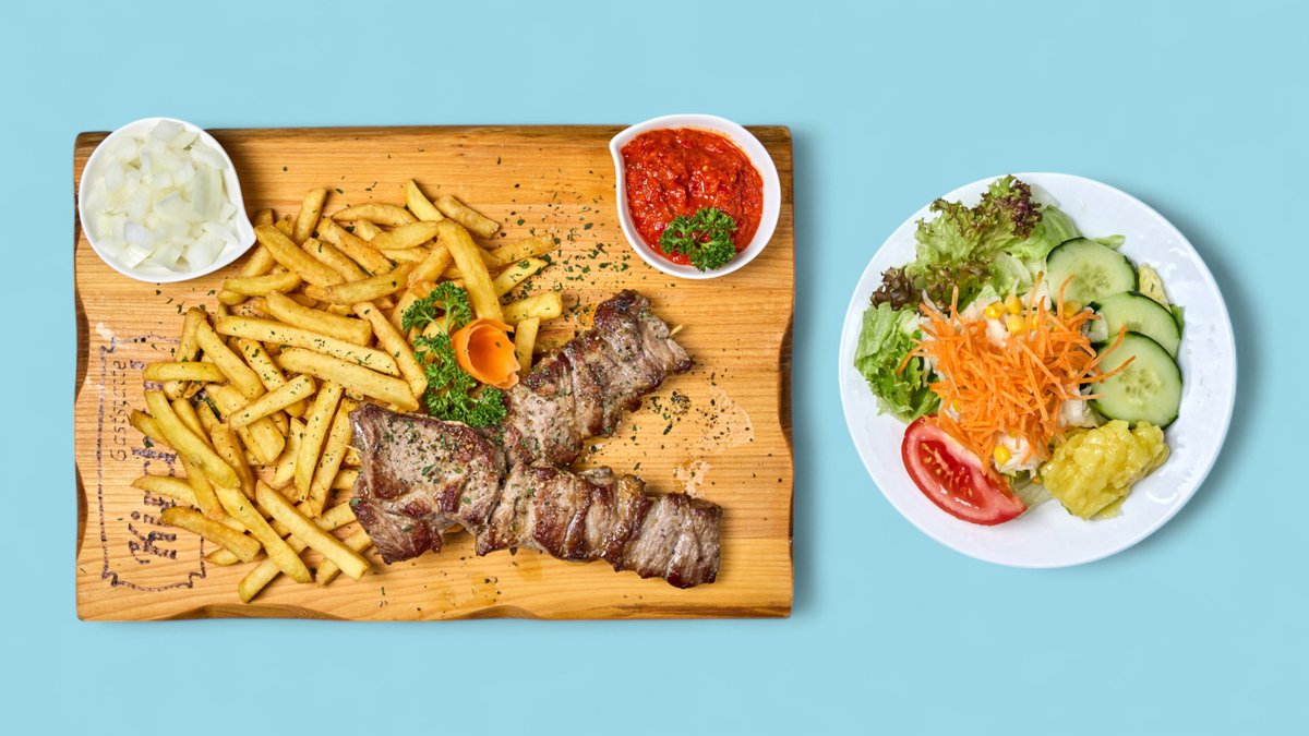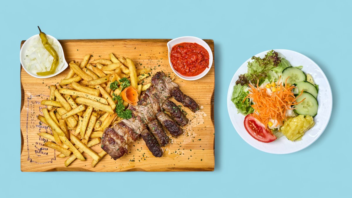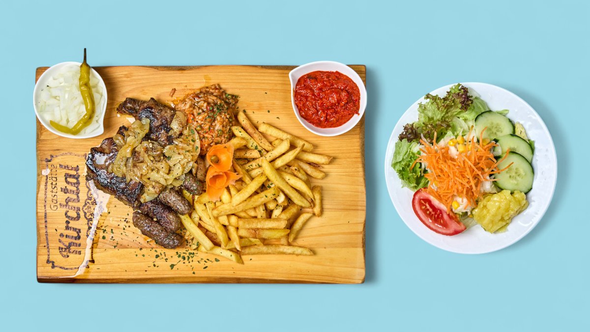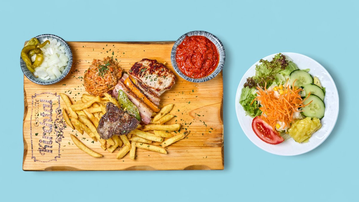 mit Cevapcici vom Rind, Raznjici, Rinderleber, Pljeskavica von Rind und Schwein, Hähnchenoberkeule, Speck vom Schwein, Peperoni, Pommes frites und Djuvec-Reis