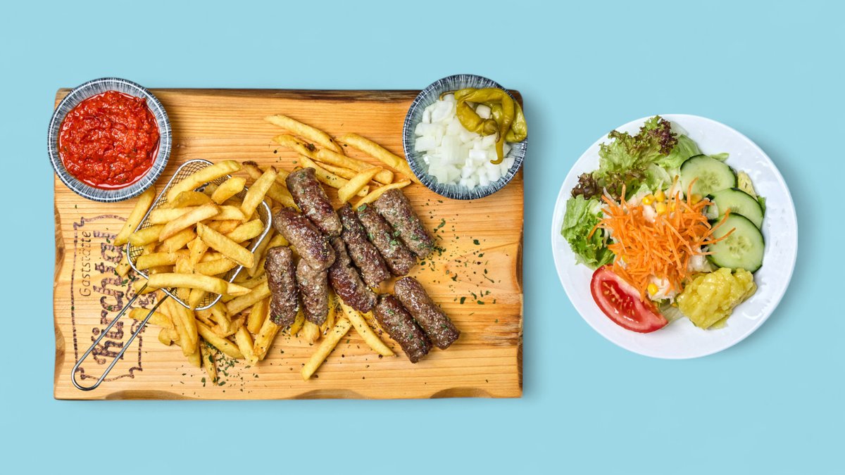 mit Cevapcici vom Rind, Peperoni und einer Beilage deiner Wahl
