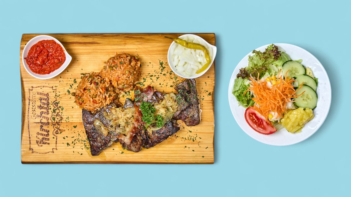 alle Gerichte werden mit Ajvar und Zwiebeln serviert