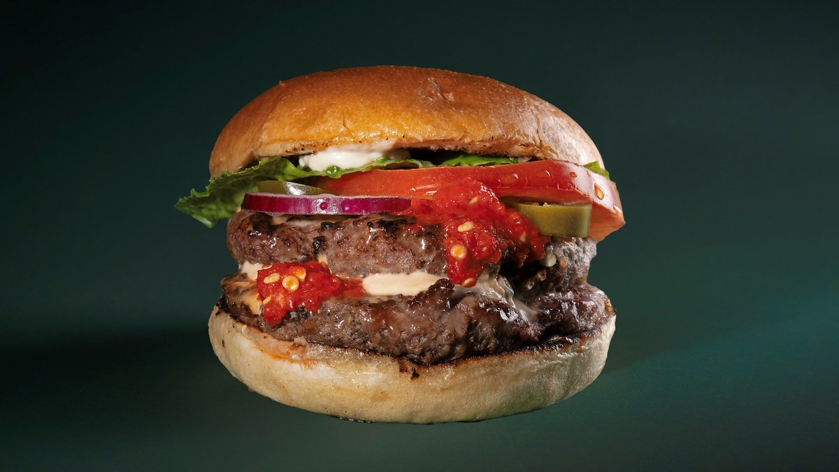 "Feurig & wĂĽrzig - noch viel besser als man es kennt." 2 Grill-Patties - Jalapenos - homemade Chilli Sauce - Salat - Tomate - Zwiebel - Essiggurke - Hobs Sauce - Ketchup - Mayonnaise