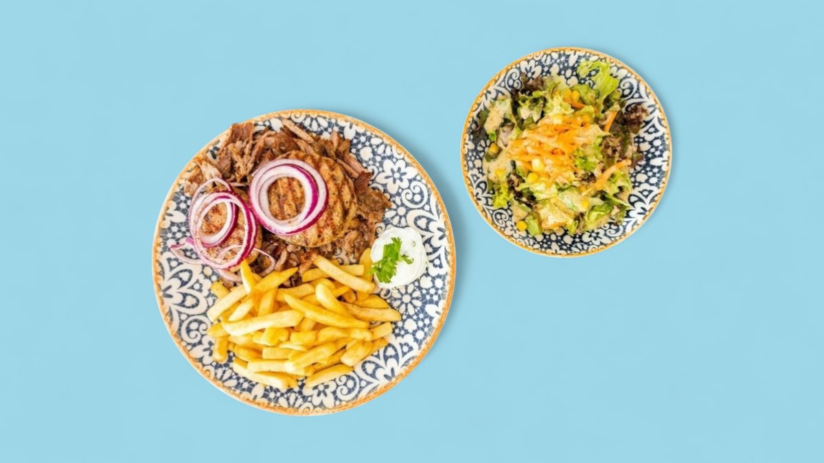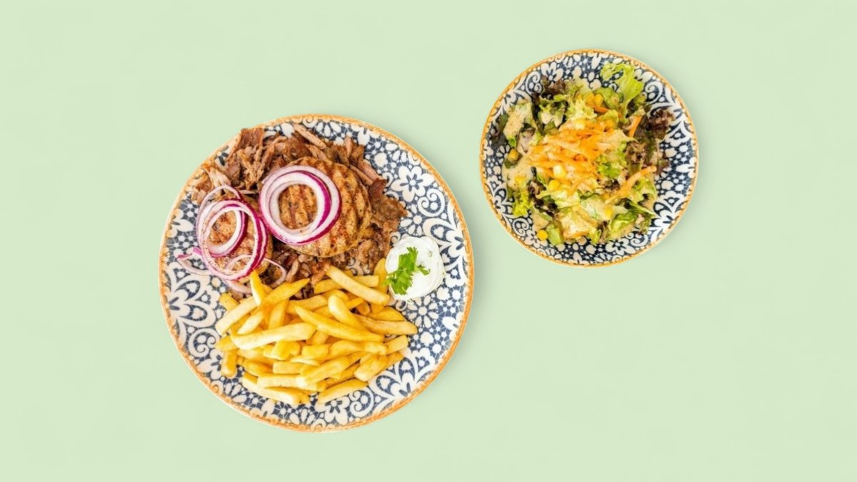 mit Gyros, Lammspießfilet, Reis, Tsatsiki und gemischtem Salat