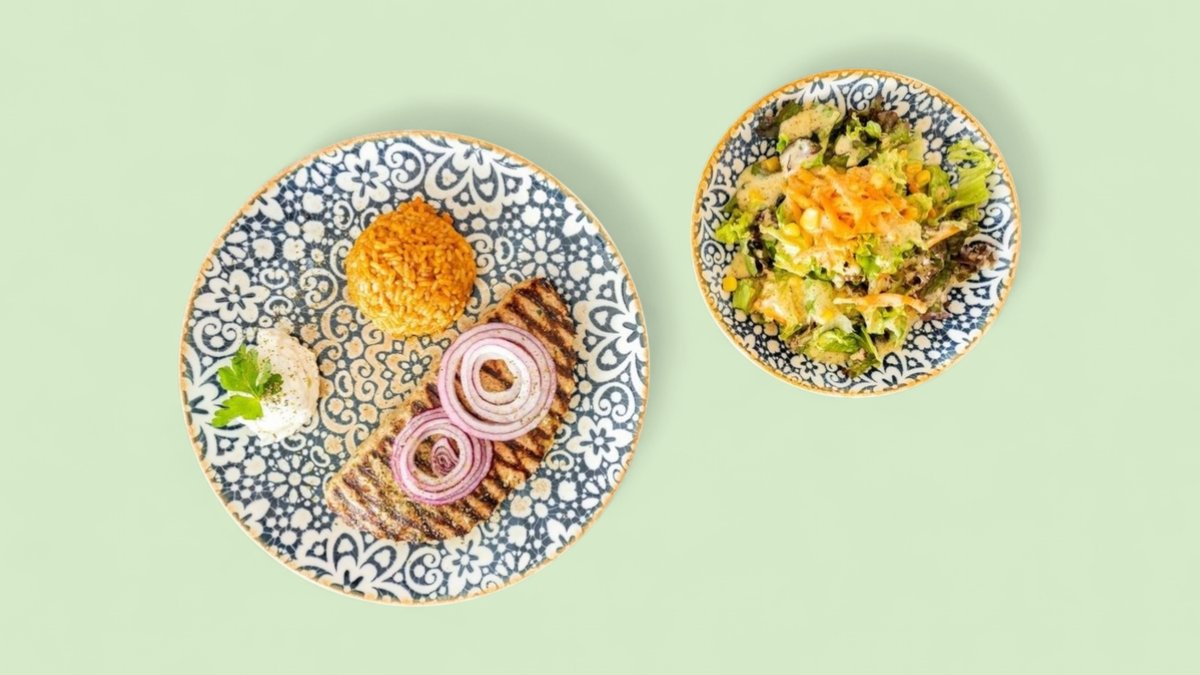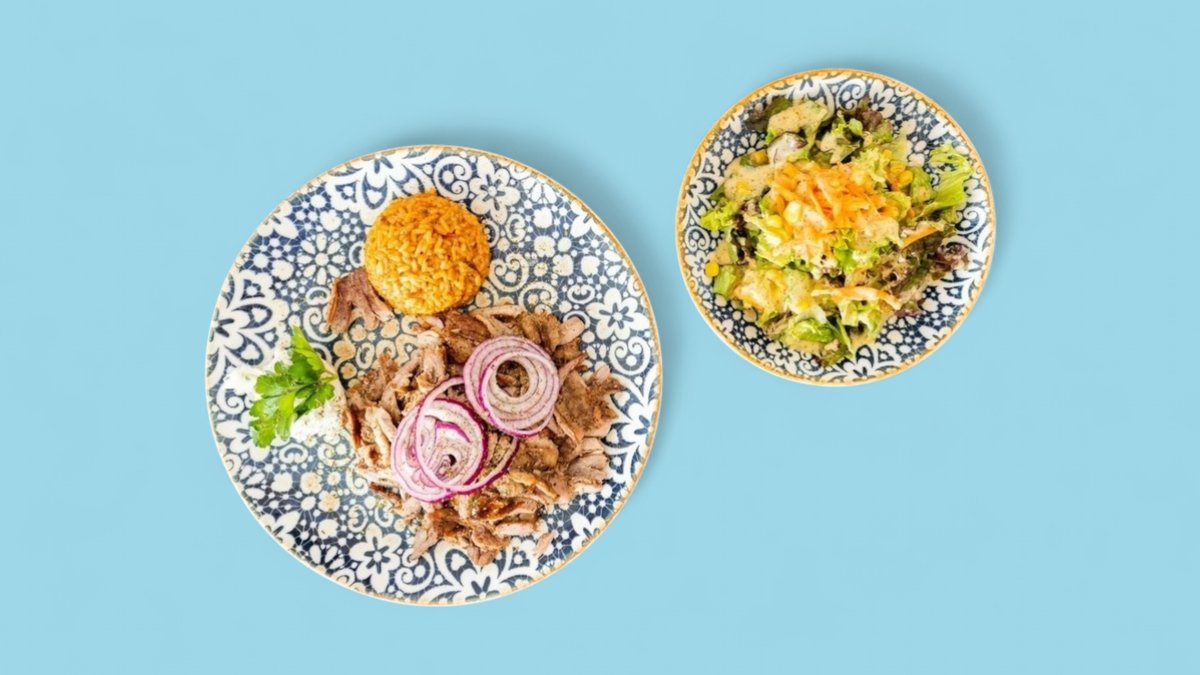 Souvlaki, Gyros und Tsatsiki, dazu Reis mit gemischtem Salat