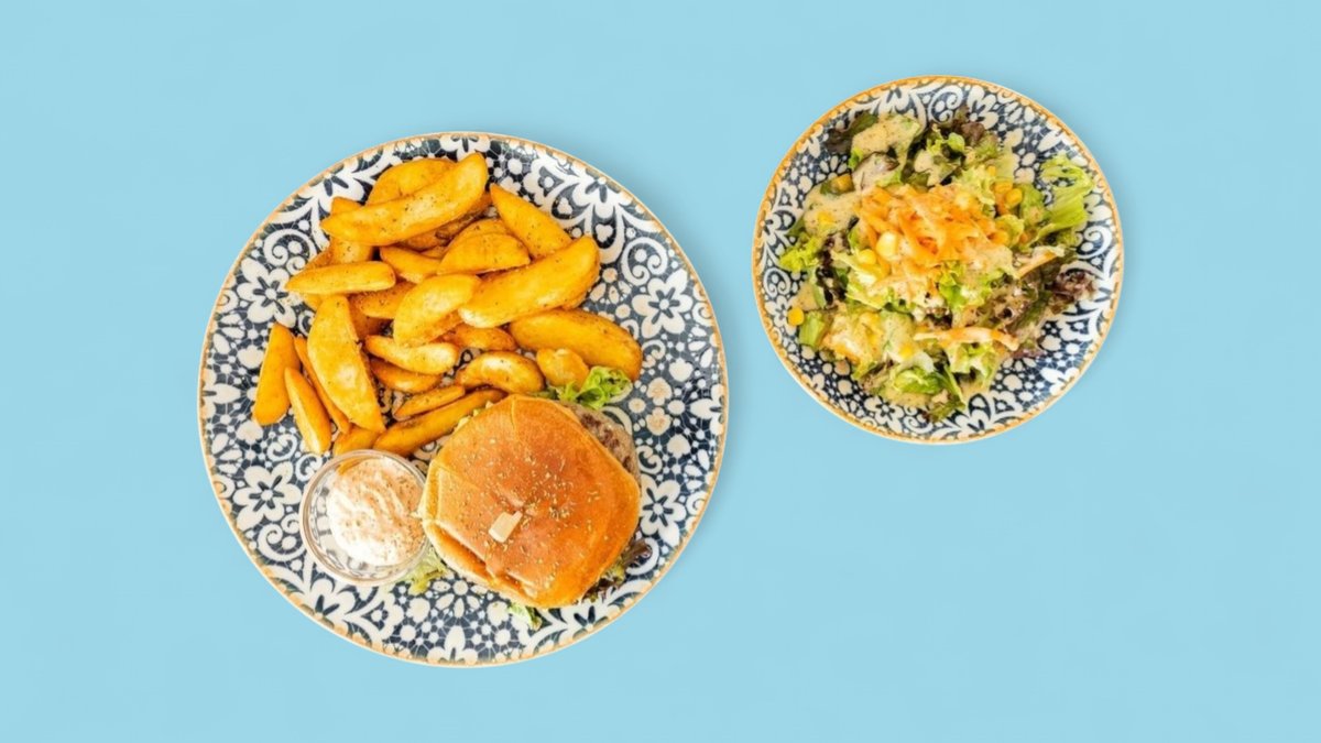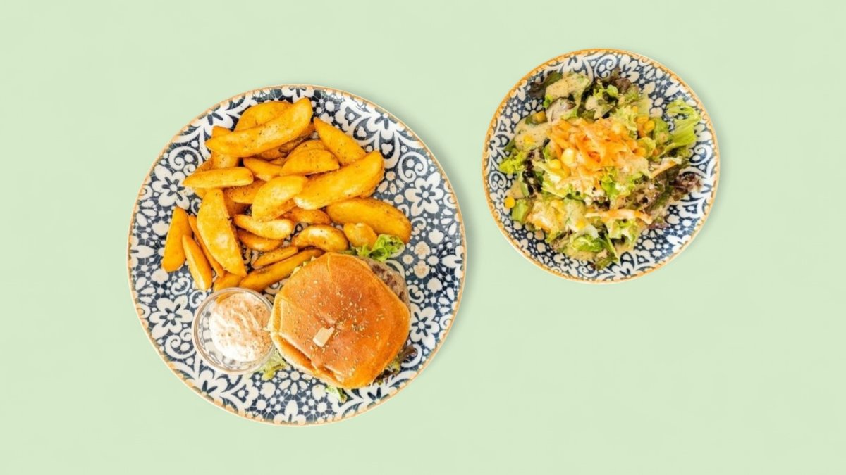 gegrilltes Rindfleisch aus 100 % Black Angus Beef mit Bacon und Käse, Tomatenscheiben und Blattsalatt, dazu Pommes und gemischtem Salat