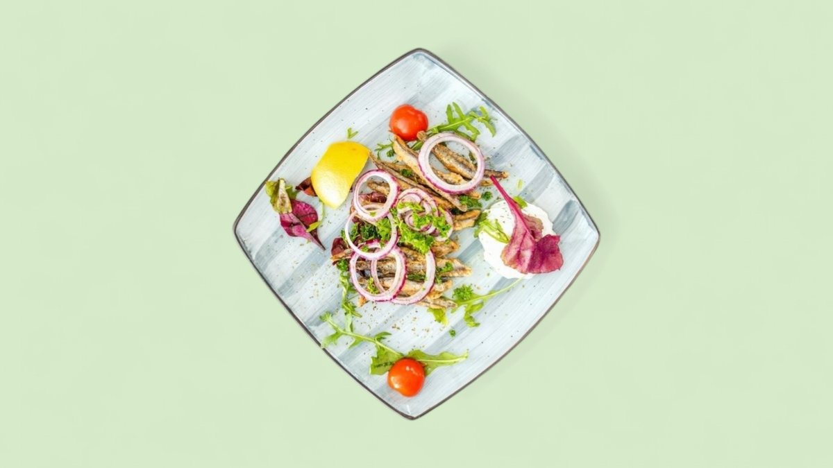 Fischrogen-Crème mit Kartoffelpüree, Olivenöl und Zitronen