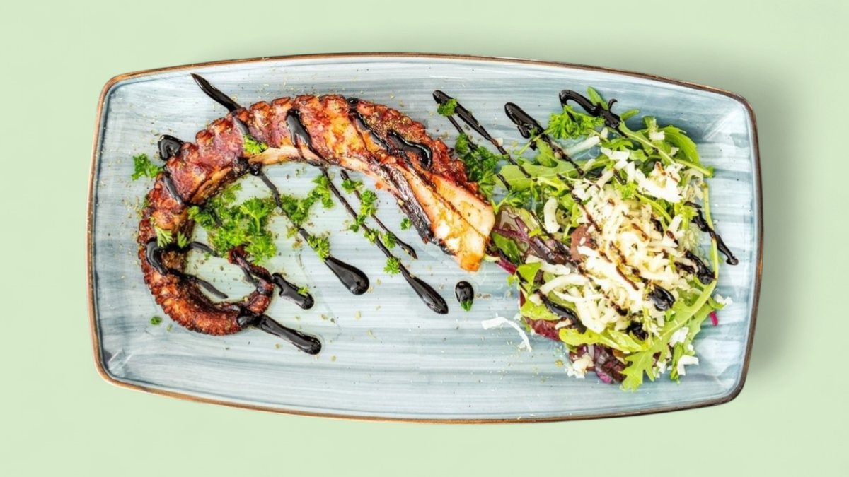 Kalamares vom Grill mit weißer Taramas, dazu Reis und gemischter Salat