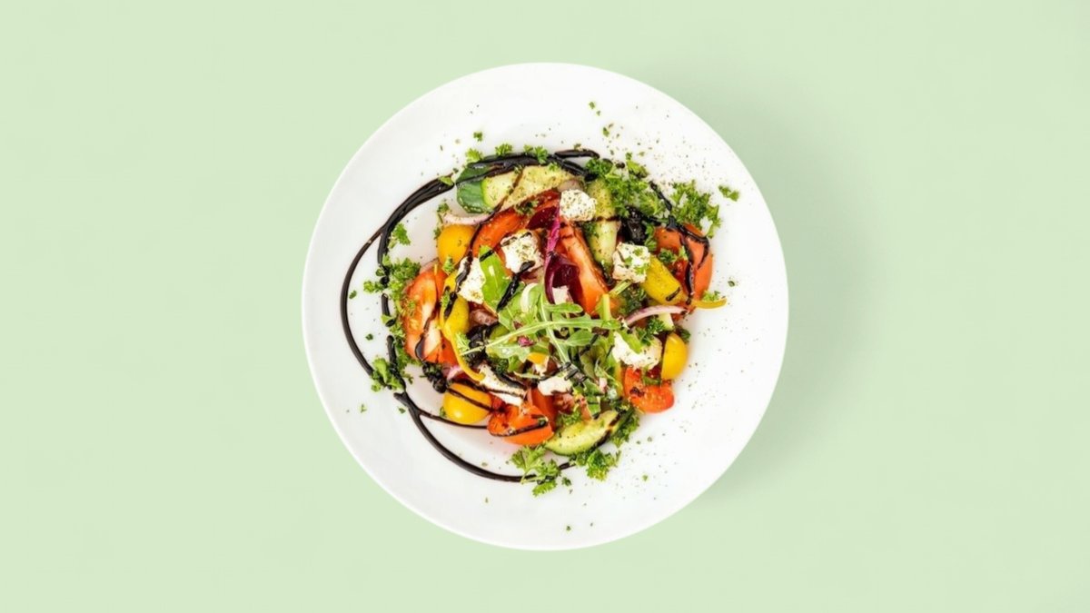 mit Fetakäse, Oliven, Peperoni, Kapern, Croutons, Zwiebeln, Tomaten, Gurken und Paprika