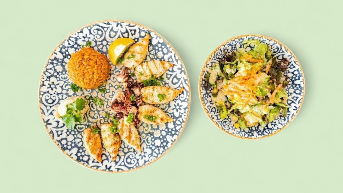 Gyros und Kalamares vom Grill, dazu Tsatsiki, Reis und gemischter Salat