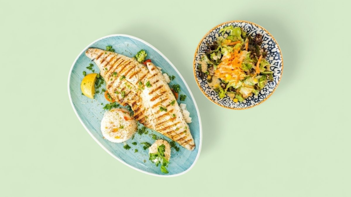 vom Grill mit weißer Taramas, Basmatireis und Gemüse, dazu gemischter Salat