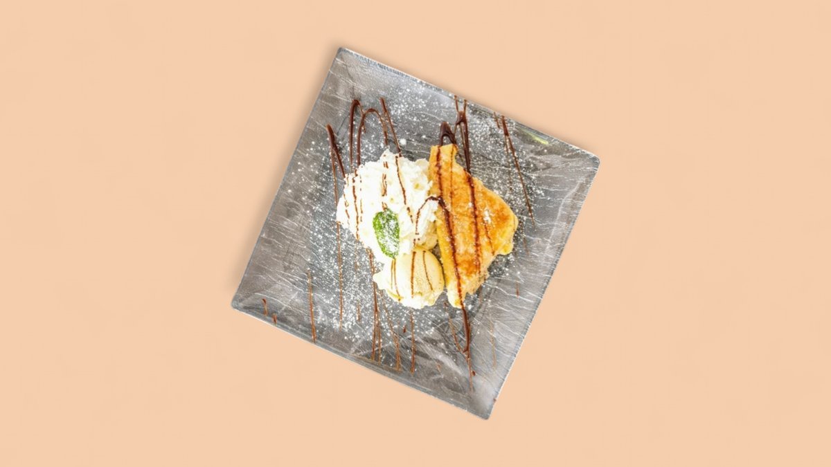 Blätterteig mit Vanillecrème gefüllt, dazu Vanilleeis und Schokosirup