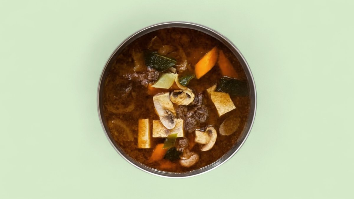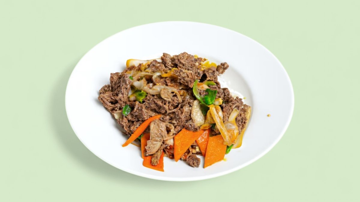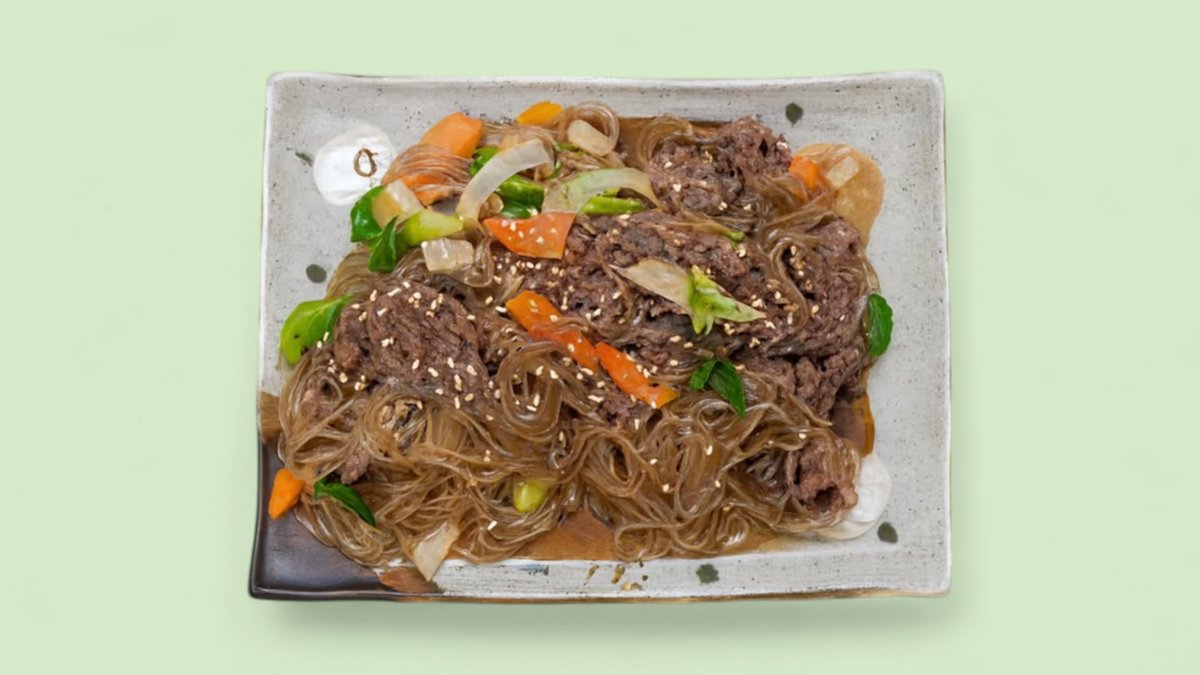 mit Rindfleisch, Gemüse, Süßkartoffel-Nudeln
