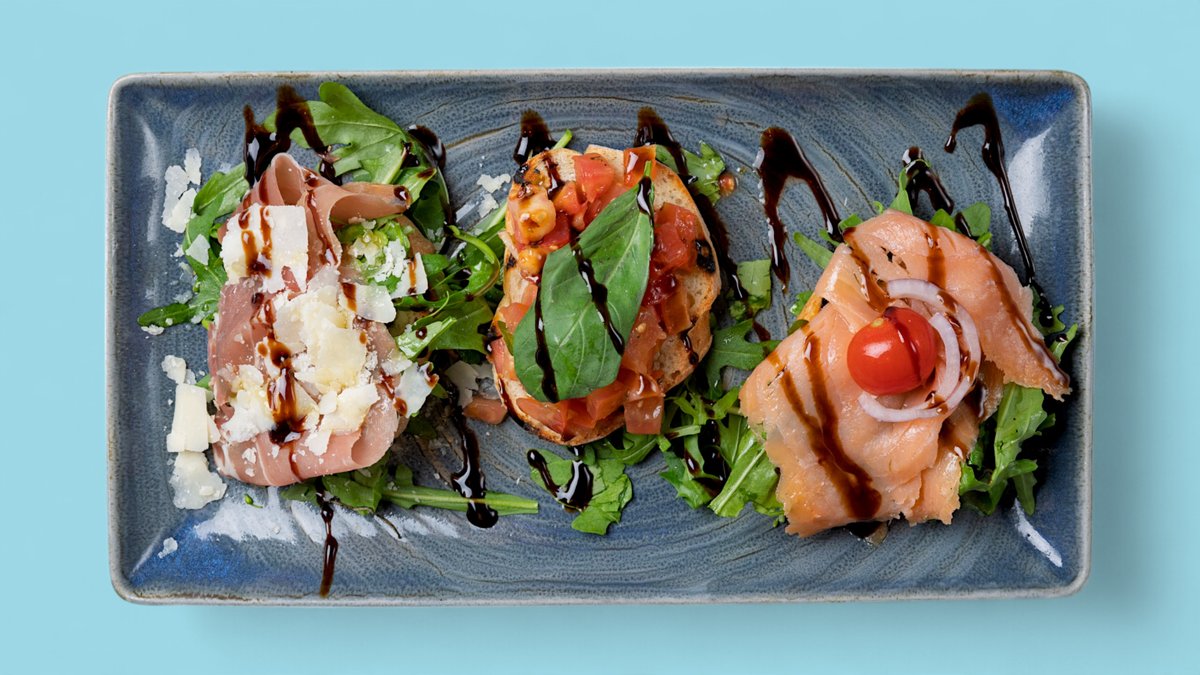 geröstete Weißbrotscheiben mit geräuchertem Lachs, Rucola, rohem Schinken, Tomatenwürfeln, Basilikum