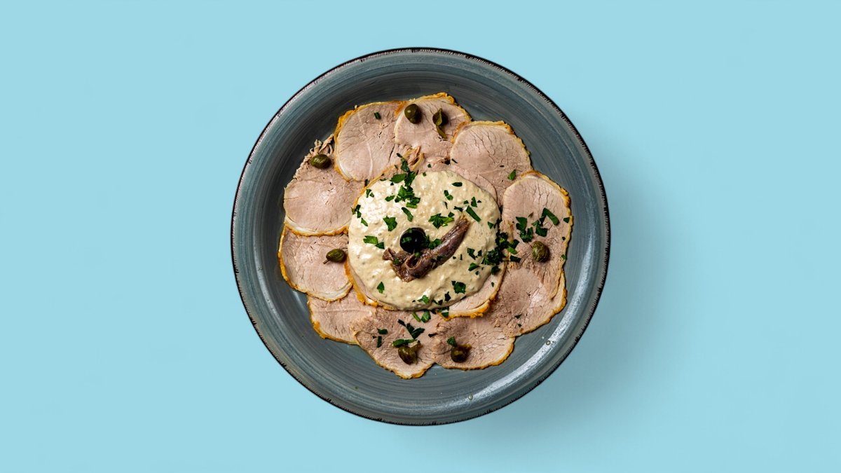 dünne Kalbfleischscheiben mit Thunfischsoße und Kapern