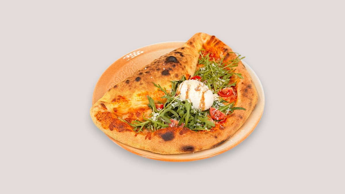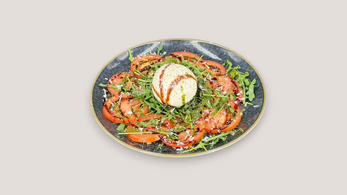 mit Buffalo Mozzarella, Rucola, Tomaten, Balsamico-Creme und Grünem Pesto