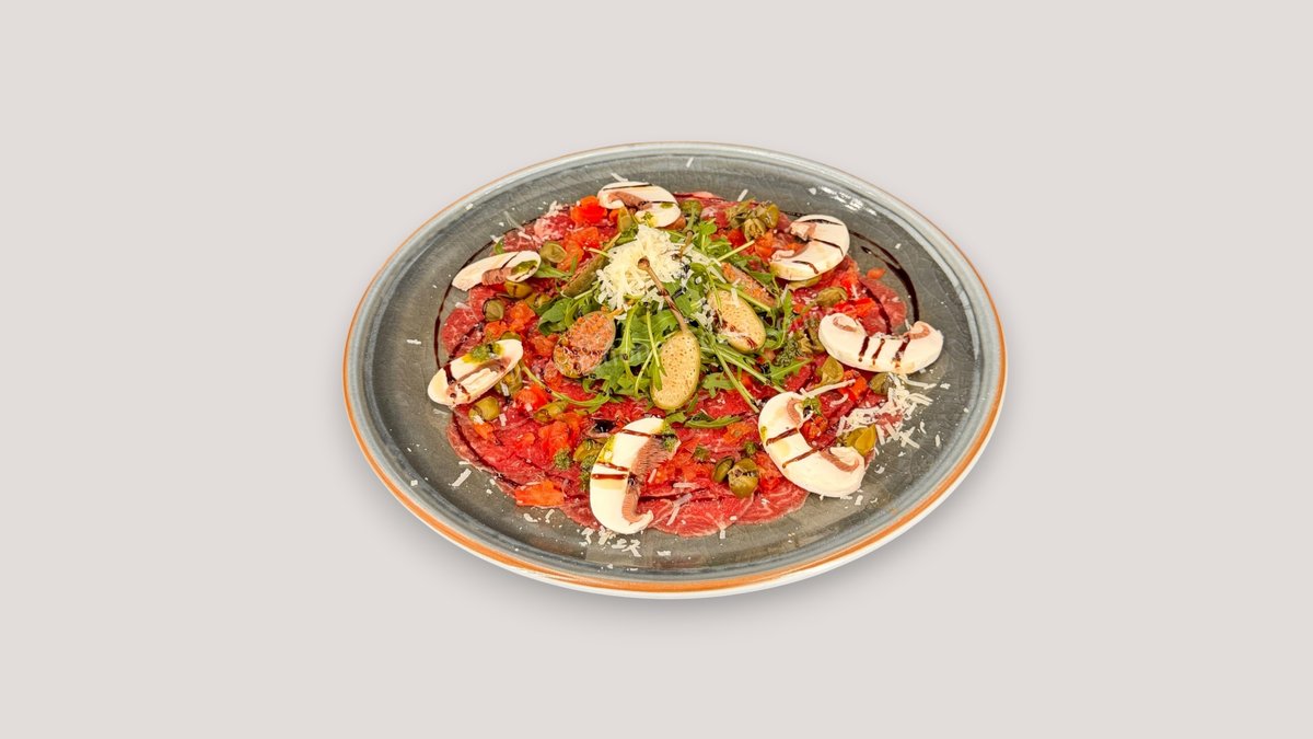 Rinder Carpaccio mit Rucola, Kapern, Champignons, Cocktailtomaten, Parmesan und Olivenöl