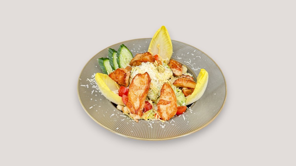 mit Hühnerbrustfilet vom Grill, Romana Salat, Gurken, Kirschtomaten, Parmesan, Croutons und Anchovy Dressing