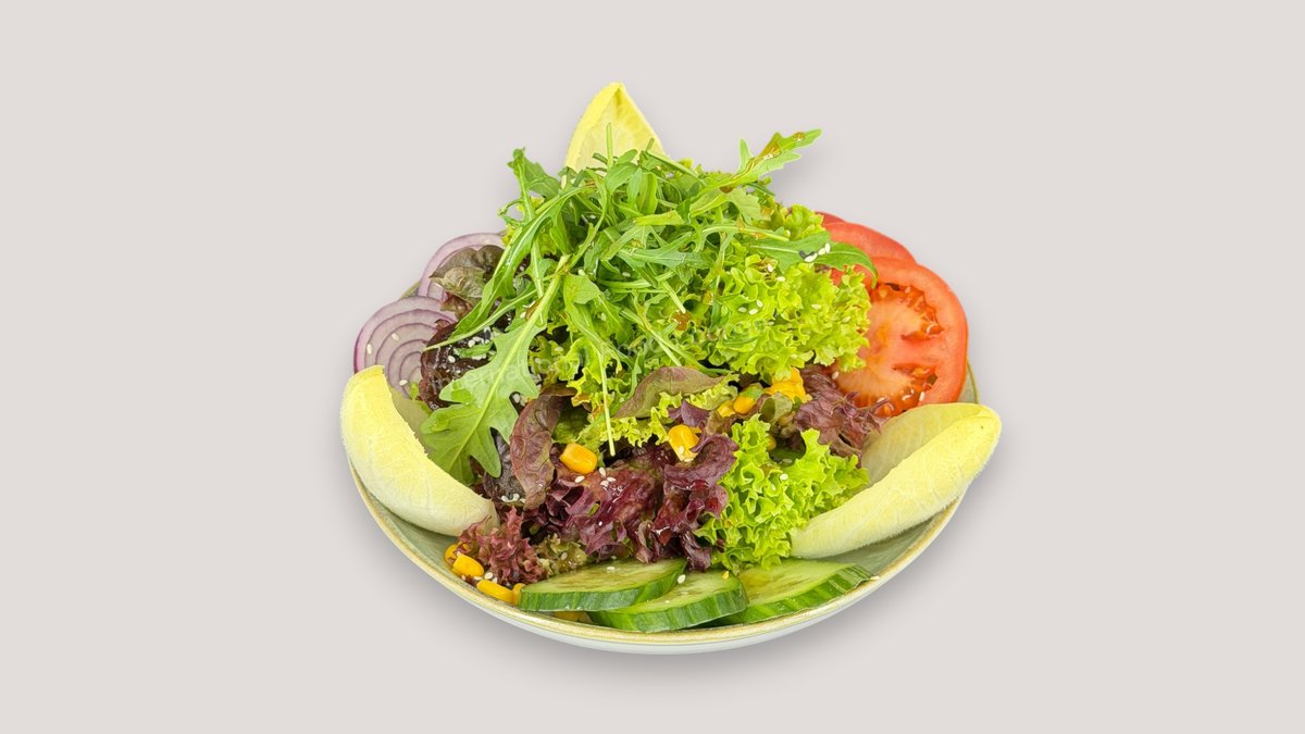 mit Salat, Tomaten, Mais, Zwiebeln, Gurken, Rucola, Sesam und Balsamico
