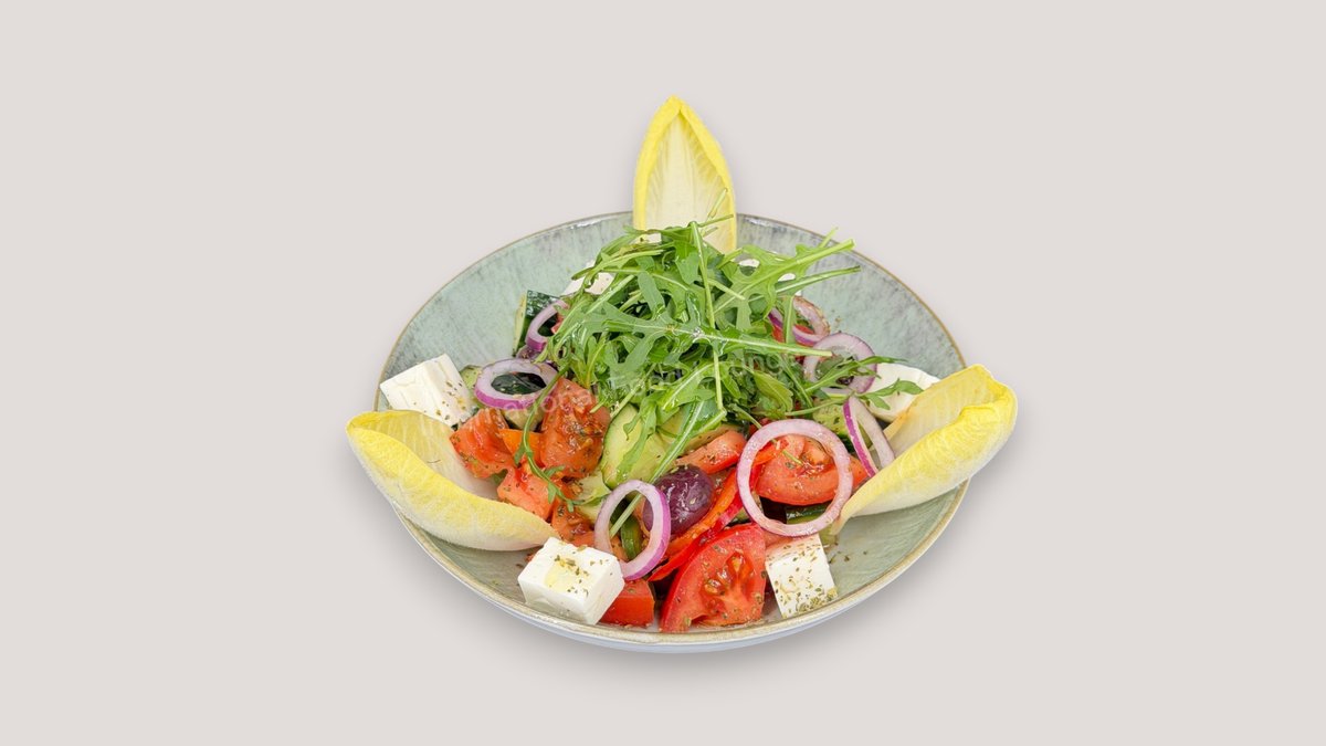 mit Tomaten, Gurken, Oliven, Zwiebeln, Paprika, Fetakäse, Olivenöl und Apfelessig