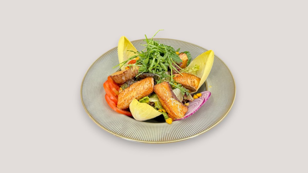 mit Lachsfilet vom Grill, Salat, Tomaten, Rucola, Zwiebeln, Gurken, Mais und Balsamico