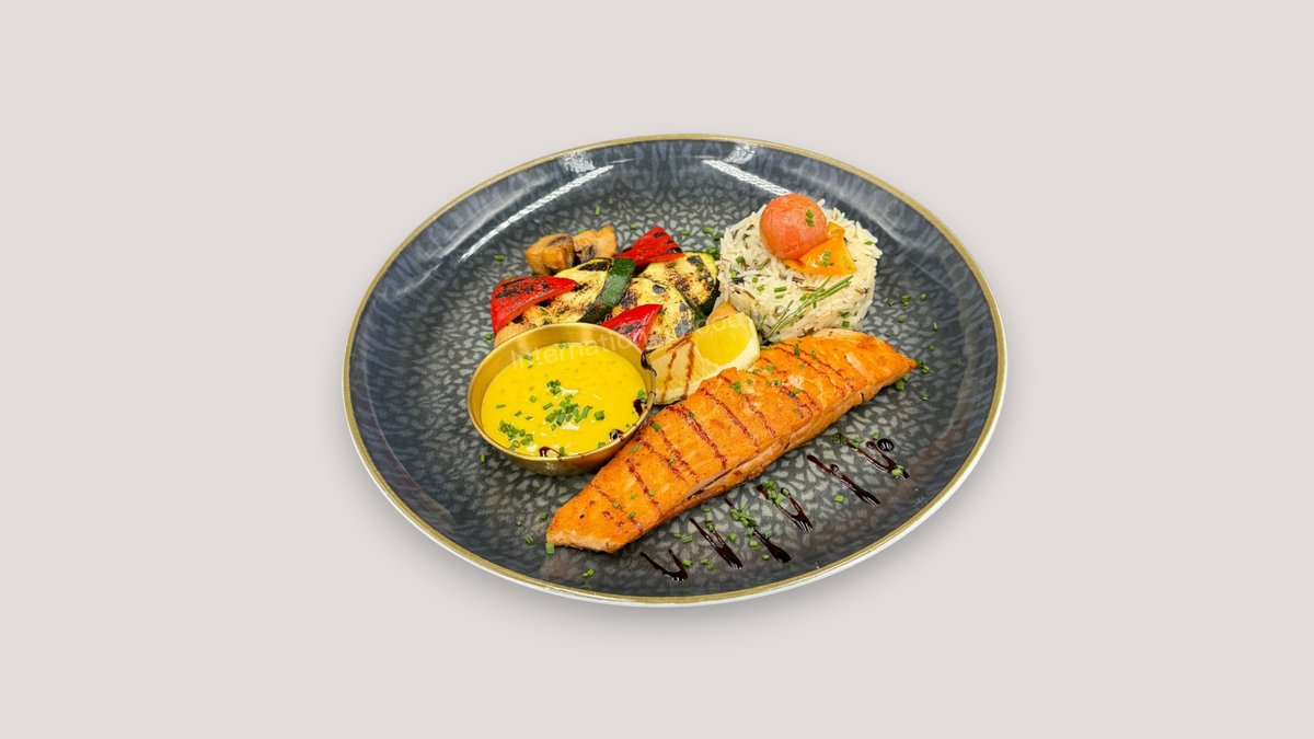 Wolfsbarschfilet auf Honig-Wein Soße mit Kaisergemüse und Anna Kartoffeln Enthält Alkohol, für Kinder und schwangere Frauen nicht geeignet