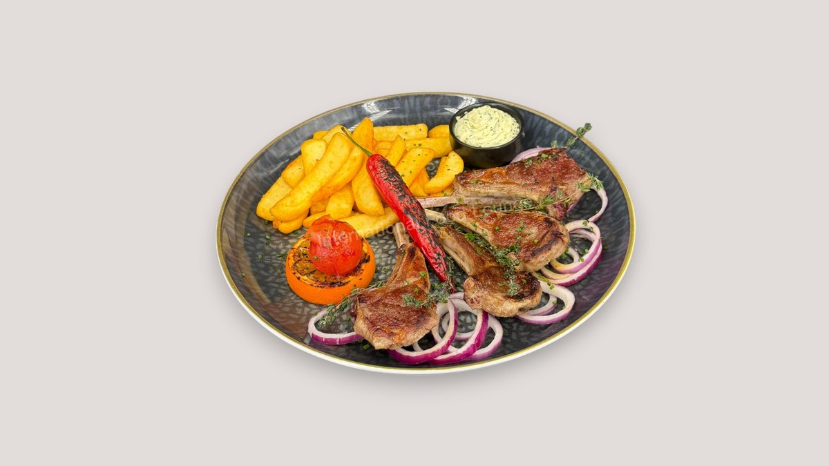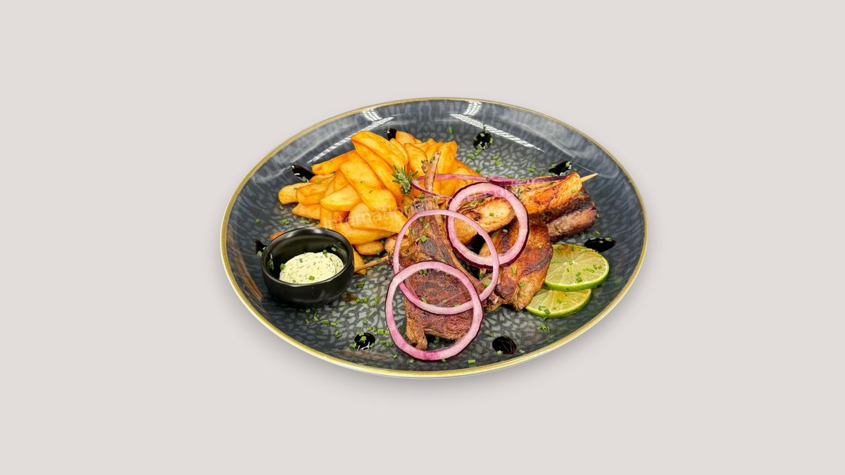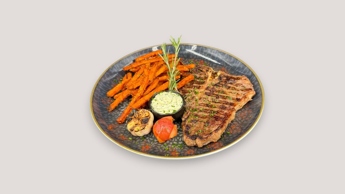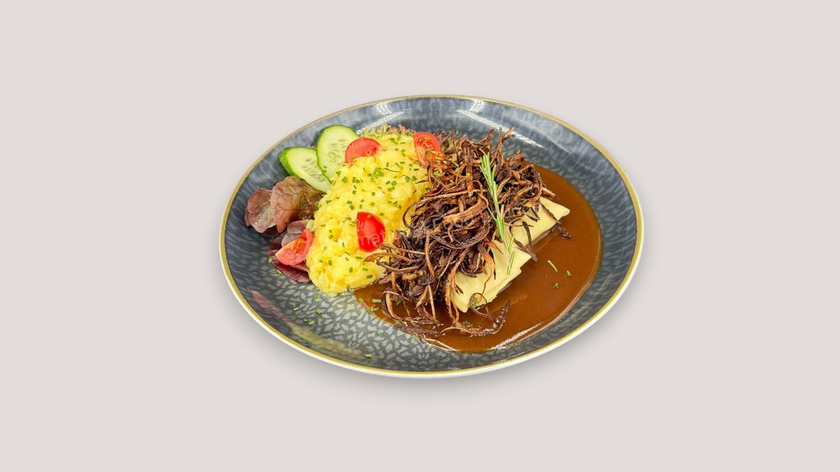 gegrillte Rinderleber mit karamellisiertem Apfel, Bratkartoffeln, Röstzwiebeln und Bratensoße