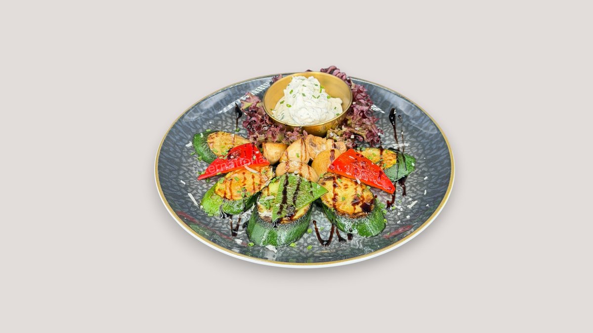 mit Zucchini, Paprika, Champignons, Parmesan und Joghurt Dip