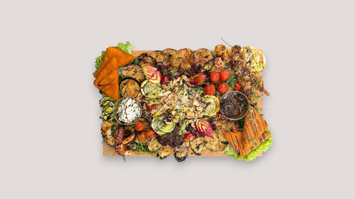 für 4 Personen mit Oktopus, Meeresfrüchten, Garnelenspießen, Schafskäse-Ecken, Zucchini Chips und Auberginen Chips