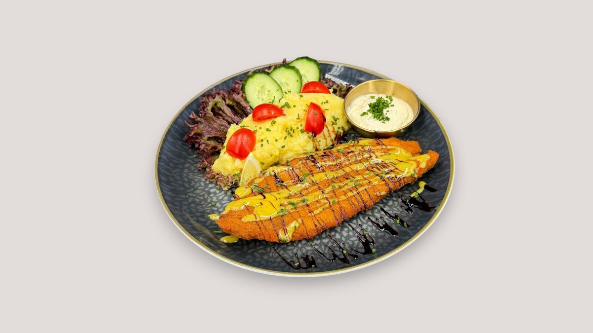 paniertes Rotbarschfilet mit Kartoffelsalat und Remoulade