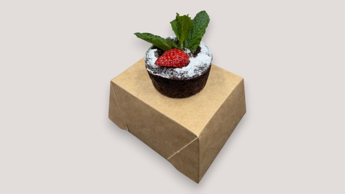 Schokoladenkuchen mit flüssigem Schokoladen Kern Das Gericht wurde mit Schokolade zubereitet und kann Spuren von Nüssen enthalten
