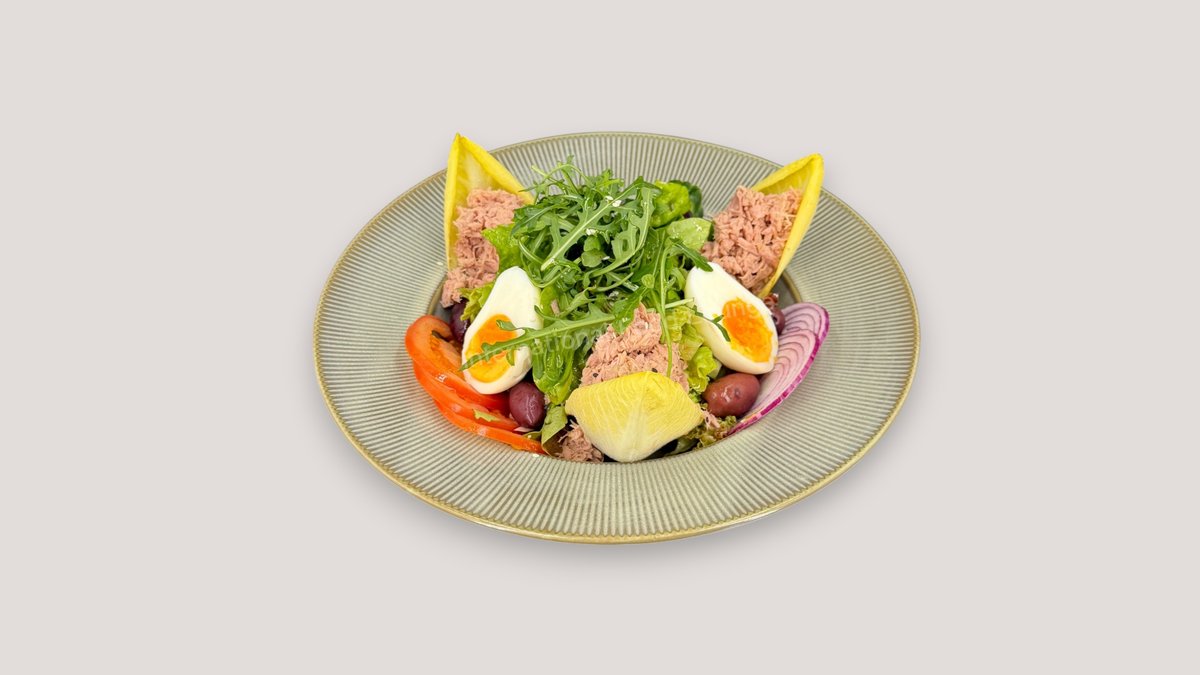 mit Salat, Tomaten, Gurken, Zwiebeln, Oliven, Thunfisch, Ei und Balsamico