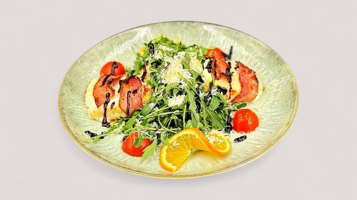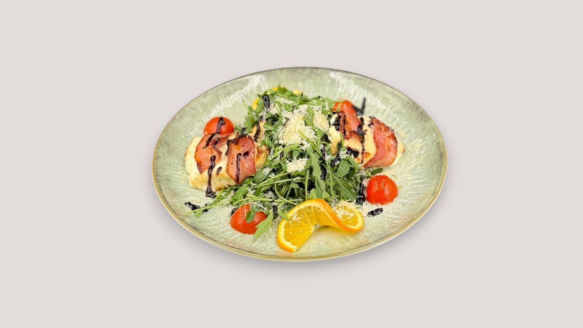 gebackener Fetakäse im Speckmantel mit Rucola und Parmesan