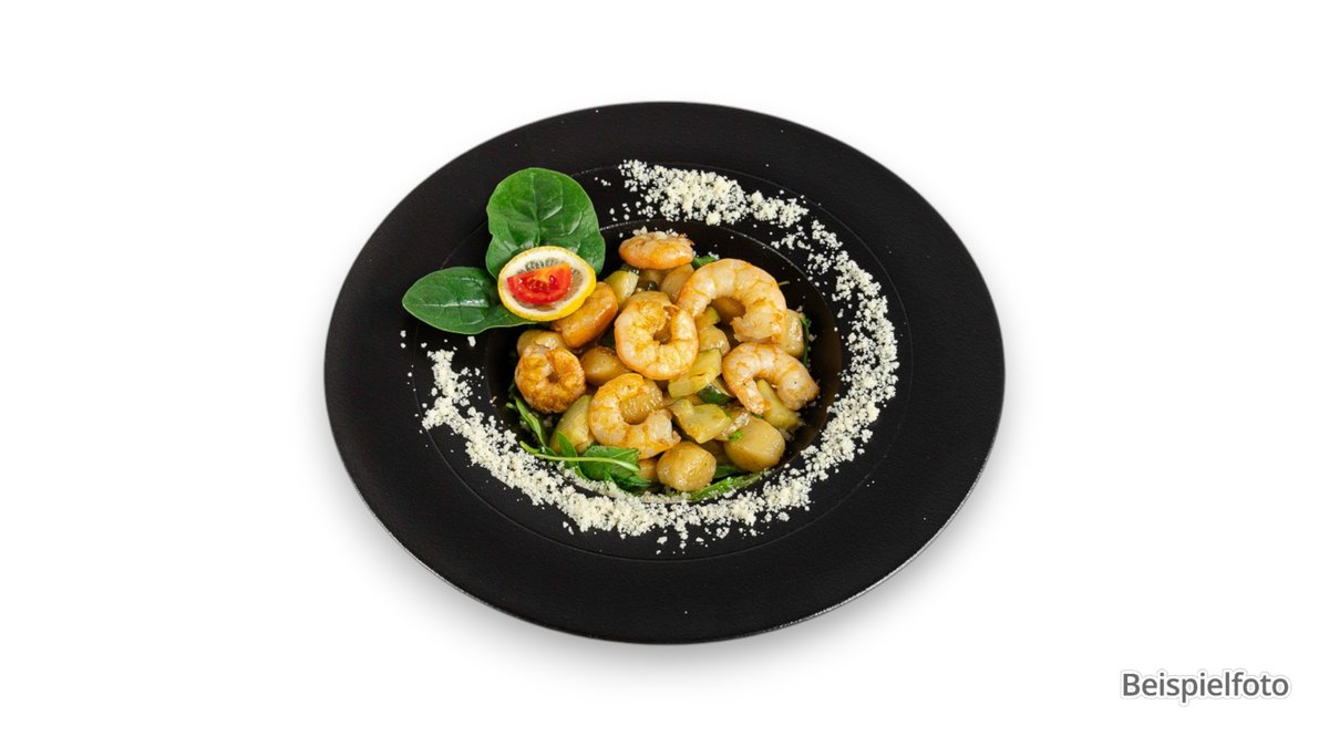 warme Vorspeise Calamaris, 1 Hähnchenspieß, Shrimps in Knusperteig gebraten und Joghurtsoße