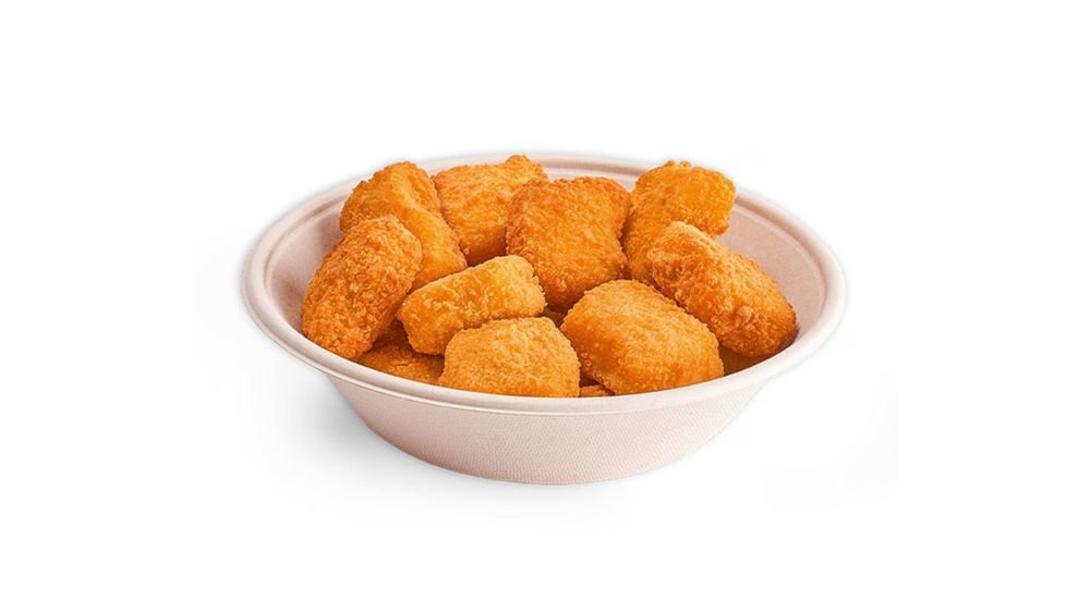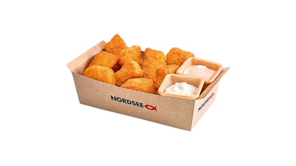 Knusprig und einfach lecker: 15 panierte Nuggets aus Alaska Seelachsfilet, aus Blöcken geschnitten, dazu drei Saucen nach Wahl.