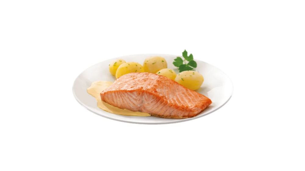 Saftig, aromatisch, auf den Punkt gegart: Unser norwegisches Lachsfilet wird auf der Haut gebraten und entfaltet so sein volles Aroma. Dazu gibt’s eine Beilage und Sauce nach Wahl.