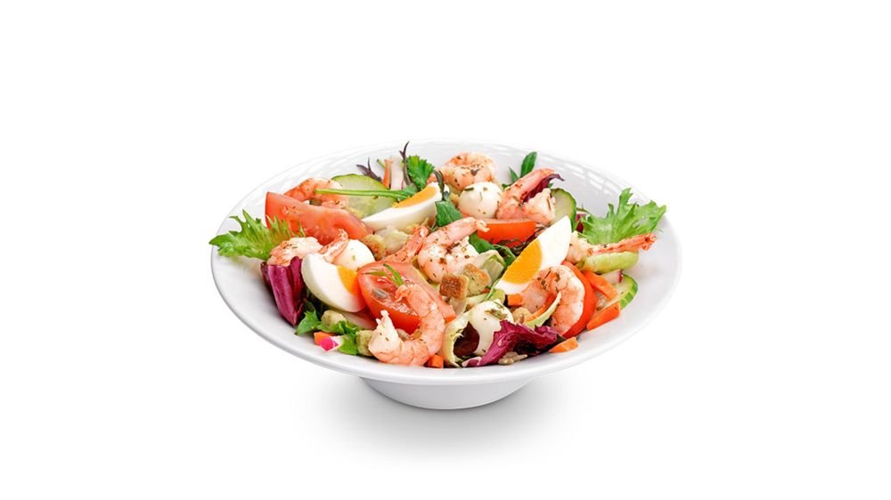 Salat-Mix, Garnelen in Kräutermarinade, Tomate, Gemüse-Mix, Ei und Gurke.