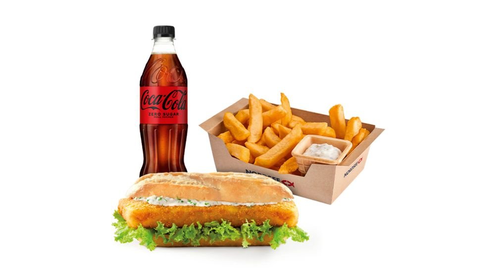 Der Classic Fish Burger mit knusprigem Hoki-Filet, Honig-Senf-Sauce, Ketchup und Gewürzgurke im Brioche-Brötchen. Dazu knusprige Pommes, eine Sauce nach Wahl und ein 0,5l Getränk.