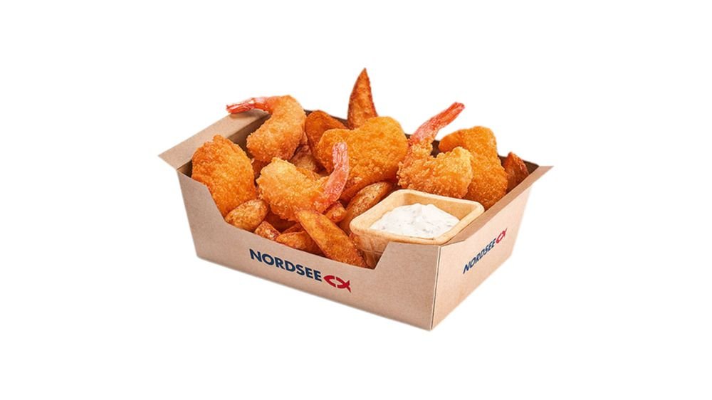Drei Lieblinge, eine Box: Knusprige Knoblauchgarnelen, zarte Alaska Seelachsfilets und herzhafte Kartoffelecken, dazu eine Sauce nach Wahl. Für alle, die sich nicht entscheiden wollen.
