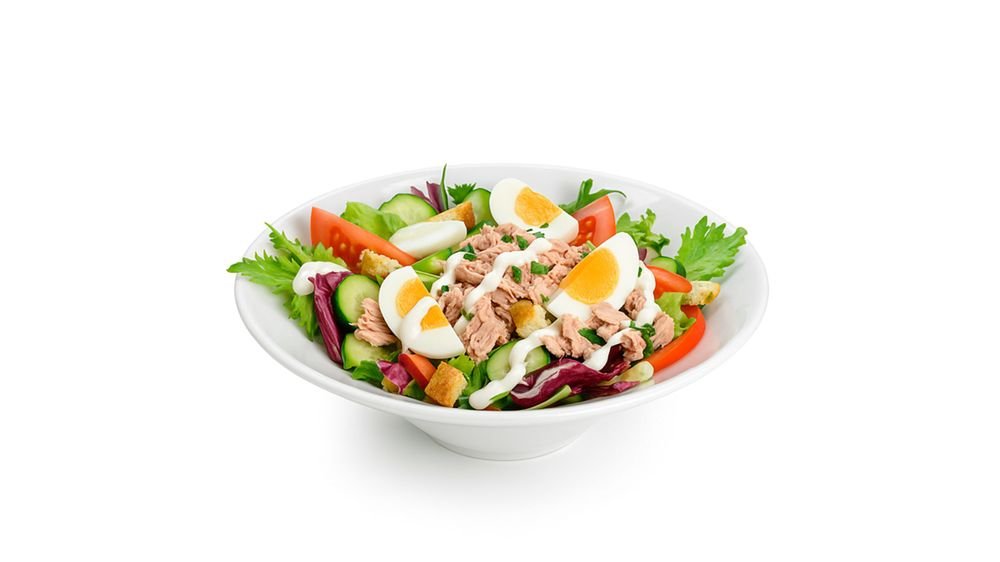 Salat-Mix, Thunfisch, Tomate, Gemüse-Mix, Ei, Gurke und Zwiebeln