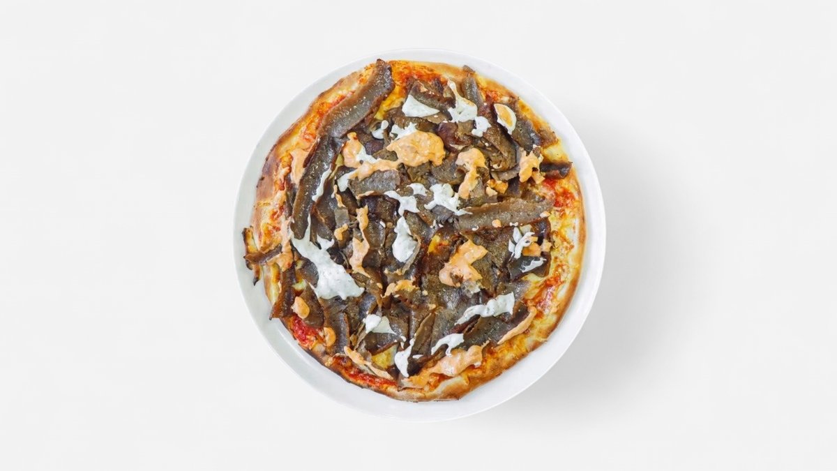 mit Kalbfleisch, Salat, Kraut, Tomaten, Zwiebeln, Joghurtsoße und scharfer Soße